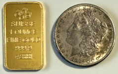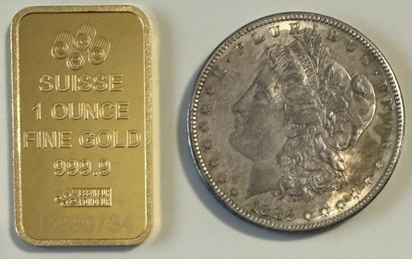 1 oz gold bar ($5,000 a/o February 2026) - Collectible 1882 Morgan silver dollar ($87).