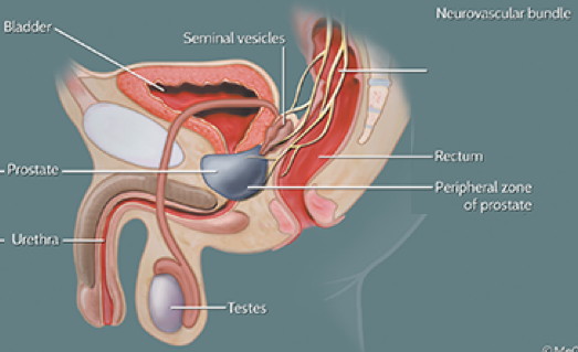 The prostate gland is about the size of a walnut. It's located just below the bladder, and it surrounds the urethra. This is a tube that carries urine and semen out of the body. The prostate is partly muscular and partly glandular. It has tubes (ducts) that open into the prostatic part of the urethra. It's made up of 3 lobes: a middle lobe, left lobe, and right lobe.