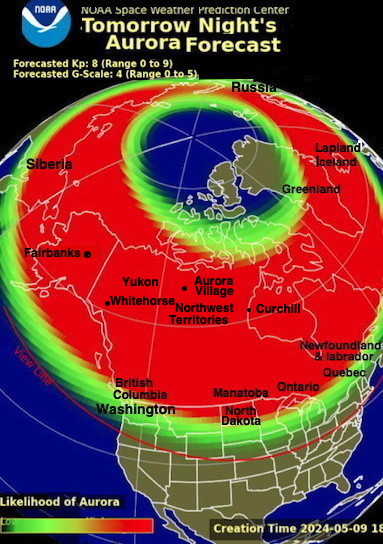 At 6 PM Thursday May 9 the National Oceanic And Atmospheric Administration (NOAA) Space Weather Prediction Center after updating their model by taking into account a X2.2 flare from AR3664 issued a Severe (G4) level geomagnetic storm watch for May 11, 2024