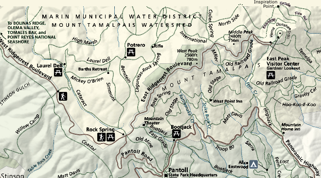 | Directions from Cal Alpine Lodge - 730 Panoramic Hwy to: Pantoll Mt. Tam SP. Hqtrs. | Mount Tamalpais East Peak |