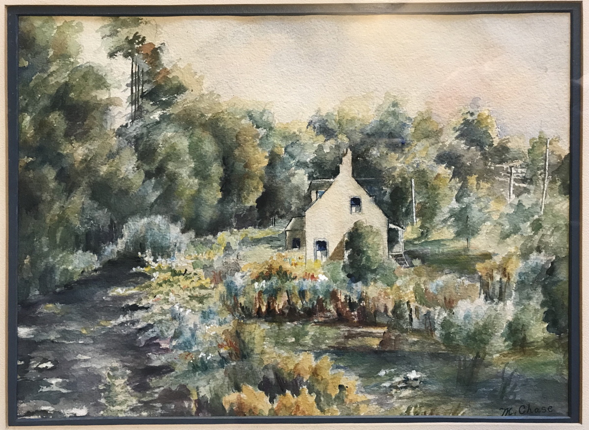 Painted by Maud Chase, a P.E.O. sister of Agnes McBride Sprague, in 1955.  She painted the scene from a colored slide of a picture taken in 1951 by Edgerton B. Sprague.  It was taken about two miles from the place where Agnes' father, Thomas McBride, was born on the Isle of Arran Scotland, August 7, 1839; The scene is near the Lagg Inn on the Isle of Arran.