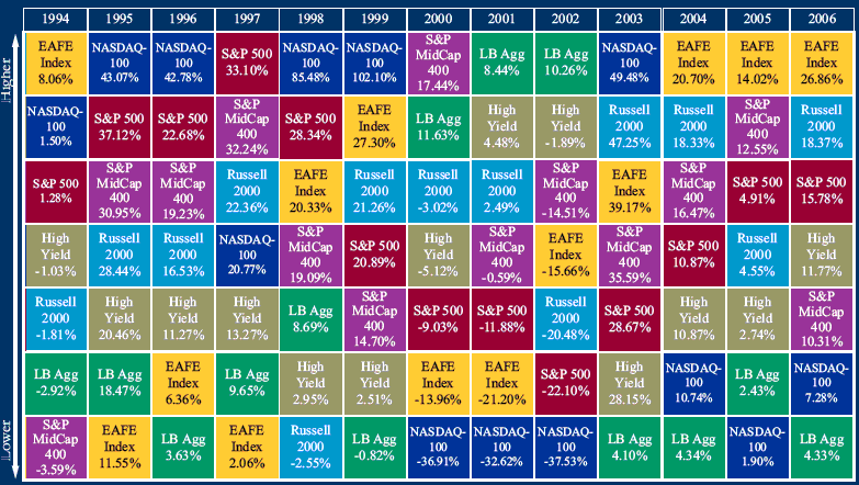 There are two schools of thought (dogmas) on asset allocation and market timing which are related. They concluded that a middle ground approach worked best. i.e. be skeptical of the market timers' claims, but be willing to modestly alter your asset allocation when the evidence in favor of doing so is particularly compelling" In the following chart classes are listed in order of performance of their market indexes. You can see from the following chart that relative class performance varies widely over time. (Performance includes dividends) ![]() Source SummitFunds.com See also Periodic Table of Index Returns 2000-2014) A Spread Sheet where you can experiment with different allocations and see results.