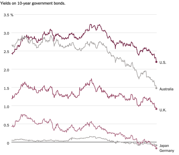 The rapid fall in rates is more of a concert. It means there is more demand for fixed rate investments over securities. T-bill rates: T-bill rates are determined by Treasury auctions, which occur weekly for short term rates. 1 year and longer maturity rate auctions are held monthly. There are 23 authorized primary dealers that include institutional investors, including banks, broker/dealers, investment funds, retirement funds and pensions, foreign accounts, insurance companies and other organizations. The higher the yields on 10-, 20- and 30-year Treasuries, the better the economic outlook. Terms: The federal funds rate is the primary tool that the Federal Open Market Committee (Fed) uses to influence interest rates and the economy. The interest rate at which banks and other depository institutions actively trade balances held at the Federal Reserve, called federal funds, with each other, usually overnight. Changes in the federal funds rate influence the borrowing cost of banks in the overnight lending market, and subsequently the returns offered on bank deposit products such as certificates of deposit, savings accounts and money market accounts. Prime Rate - The rate at which banks will lend money to their most-favored customers. The Wall Street Journal surveys the 30 largest banks, and when three-quarters of them (23) change, the Journal changes its published prime rate.