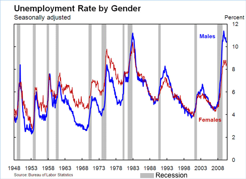 Unemployment lags the recession and peaks at the end.