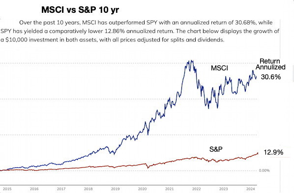 Over 10 years 2013-2023 the MSCI ver the past 10 years, MSCI has outperformed SPY with an annualized return of 30.68%, while SPY has yielded a comparatively lower 12.86% annualized return.