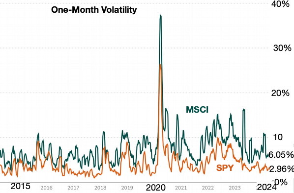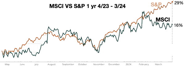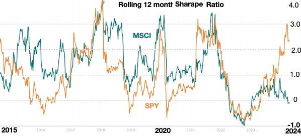 The S&P 500 beats the MSCI Wordl during some years (e.g. 4/23-4/24) because of the MSCI volatality, but over the long haul the MSCI World does better.