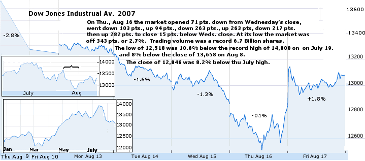 So you want to be a day trader? Aug. 16, 2007 was an example of large swings during the day with no major news. This appeared to be the bottom of a correction caused by concern over a credit crunch precipitated by problems in the sub-prime lending market. At one time on Aug. 16 the Dow Jones Industrial average was off 343 points or 2.7% from its previous close. But it rallied to close only 15.7 pts. down. ![]()