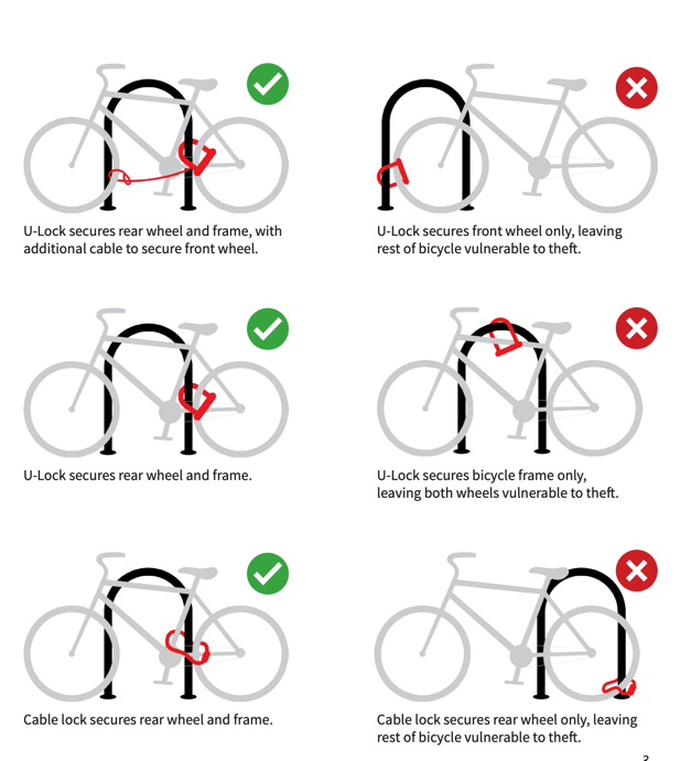 You man need a chain or cable lock for some racks or where you have to use a tree in a parking lot. Bike Racks: See Products Links: Theft Prevention | UC Davis Transportation Services The Proper Way to Lock Your Bicycle | LifeHacker How to lock your bike (properly!) | The Best Bike Lock Lock Strategy | Sheldon Brown Bike Locks School Bike Parking Guide | Rutgers
