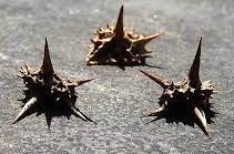 A small woody fruit (seed) – the bur – has long sharp and strong 1/5 to 1/3 inch (5 to 8 mm) - long spines which easily penetrate surfaces, such as bare feet or thin shoes, the rubber of bicycle tires, and the mouths and skin of grazing animals.