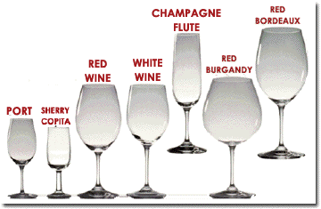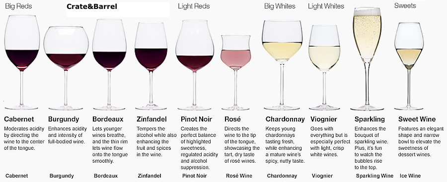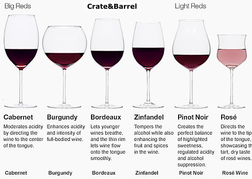 Bordeaux glasses: Tall with a broad bowl, and is designed for full bodied red wines. This shape of bowl concentrates the aromas and flavors more than a wider-bowled glass. The narrower rim directs wine to the back of the mouth. They are good for red wine in the Cabernet/Merlot family (all the varieties of Bordeaux, for example; Sangiovese-based wines, Zinfandel, Syrah/Shiraz, Tempranillo/Rioja, Gamay/Beaujolais, Grenache, Dolcetto, Aglianico, Primitivo) |