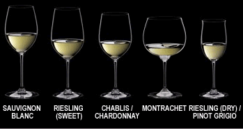 Sauvignon Blanc, Riesling, Pinot Gris/Pinot Grigio, Albariño, Chenin Blanc, Gewörztraminer, Grüner Veltliner, Pinot Blanc/Pinot Bianco, Semillon (in other words, most white wines) usually taste better in a fairly large, elongated, somewhat narrower bowl similar to the red Bordeaux glass, but the bowl can be a bit smaller. |
