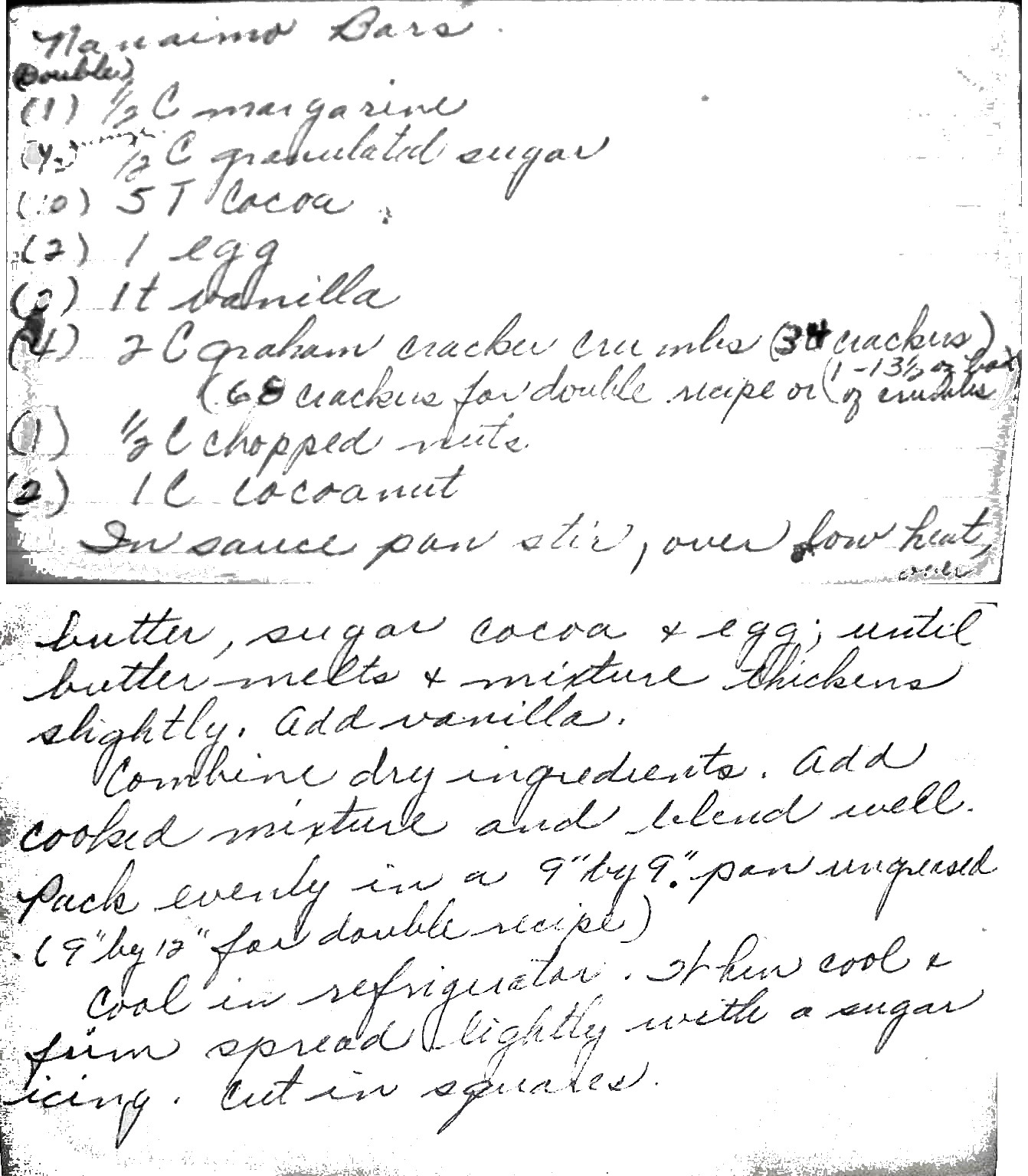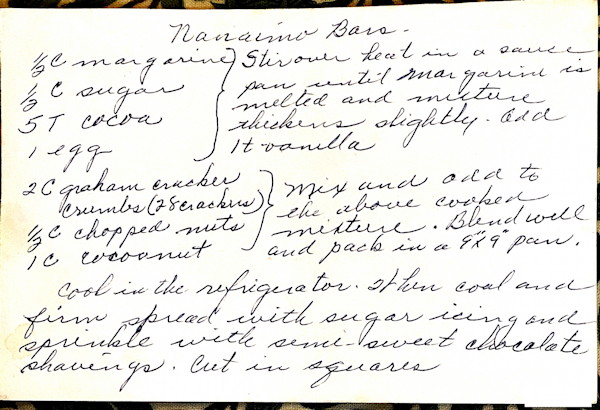1/2 cup butter, softened 1/4 cup granulated sugar 5 tablespoons unsweetened cocoa powder 1 egg, beaten 1 3/4 cups graham cracker crumbs (34 crackers) 1 cup flaked coconut 1/2 cup finely chopped nuts (optional) 1/2 cup butter, softened 3 tablespoons heavy cream 2 tablespoons custard powder 2 cups confectioners' sugar 4 (1 ounce) squares semisweet baking chocolate 2 teaspoons butter Directions1. In the top of a double boiler, combine 1/2 cup butter, white sugar and cocoa powder. Stir occasionally until melted and smooth. Beat in the egg, stirring until thick, 2 to 3 minutes. Remove from heat and mix in the graham cracker crumbs, coconut and almonds (if you like). Press into the bottom of an ungreased 8x8 inch pan. 2. For the middle layer, cream together 1/2 cup butter, heavy cream and custard powder until light and fluffy. Mix in the confectioners' sugar until smooth. Spread over the bottom layer in the pan. Chill to set. 3. While the second layer is chilling, melt the semisweet chocolate and 2 teaspoons butter together in the microwave or over low heat. Spread over the chilled bars. Let the chocolate set before cutting into squares. Nutritional Information: 16 servings Amount Per Serving Calories: 311 | Total Fat: 19.6g | Cholesterol: 49mg(recipe card1) (recipe card2)