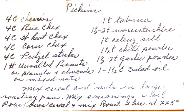 3 cups Corn Chex™ cereal 3 cups Rice Chex™ cereal 3 cups Wheat Chex™ cereal 1 cup mixed nuts 1 cup bite-size pretzels 1 cup garlic-flavor bite-size bagel chips or regular-size bagel chips, broken into 1-inch pieces 6 tablespoons butter or margarine 2 tablespoons Worcestershire sauce 1 1/2 teaspoons seasoned salt 3/4 teaspoon garlic powder 1/2 teaspoon onion powder  |
