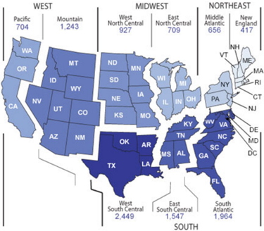 | West South Central | 2,915 | 2,536 | 2,474 | 2,745 |