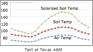The plastic sheets allow the sun's radiant energy to be trapped in the soil, heating the top 12 to 18 inches. When properly done, the top 6 inches of the soil will heat up to as high as 150°F, depending on the location.