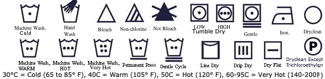 Links: Laundry Symbols at TextileAffairs.com (wash, dry, iron, dry clean) How to Read Laundry Symbols | Laundry Tips - Tide Stain Removal Removing Musty Smell in Clothes Understanding Clothing Care Labels at portlaoiseGuide.com (Ireland) Labelling Codes for textile care General Fabric Care Guide at ClothingDictionary.com Cleaning Products here Protectants and waterproofing (for rubber, vinyl, plastic, fabrics, nylon, synthetics...) Return to Home and Garden