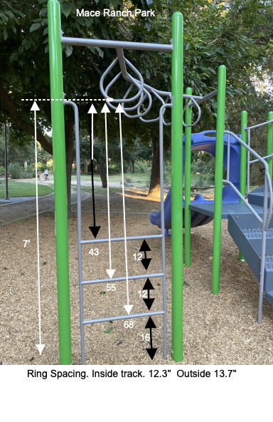 The Consumer Product Safety Commission (CPSC) has developed safety standards for playground equipment, including monkey bars. According to their guidelines, the horizontal distance between the bars should be at least 9 inches, and the height of the bars should be between 6 and 8 feet from the ground.