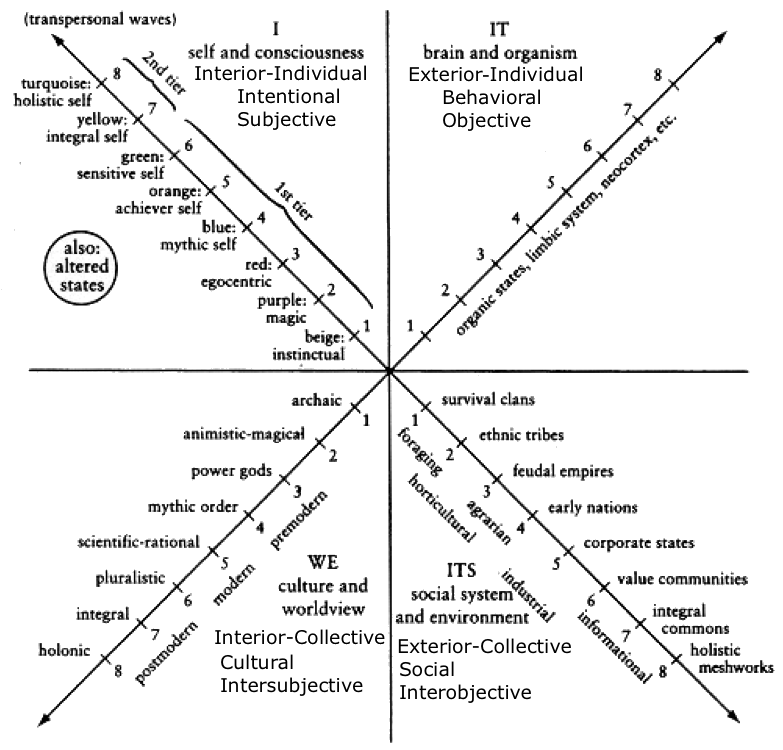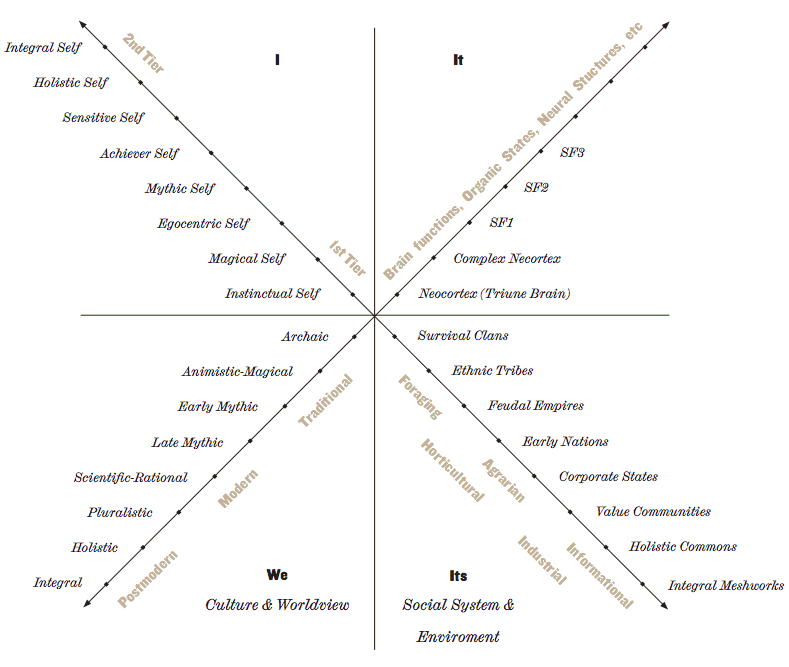 In A Theory of Everything, Wilber (2000) integrates the work of the theorists, Graves and Gebser, as well as that of Piaget, on various axes of his AQAL (all-quadrant, all-level) model.