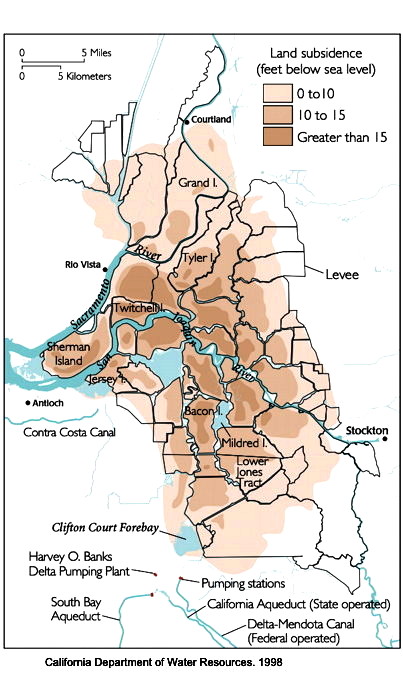 Many islands in the Delta are below sea level, relying on levees for protection against flooding and tidal inundation. Most of them are farmland