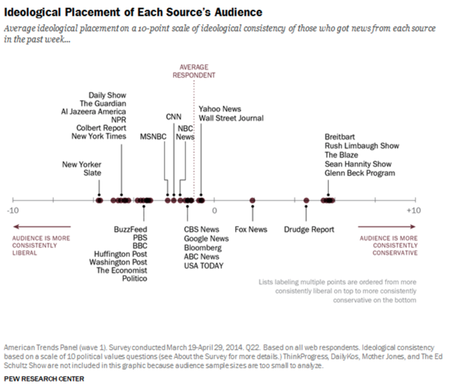 They start with Americans for Democratic Action (ADA), a liberal lobbying group, ratings of the voting records of Senators and Representatives. They looked at the ratings of politicians who cited any of 200 prominent think tanks positively and then looked at how various media sources quoted the same sources. Various media scored as follows: Conservative 4.7 Tom Delay (R.-Tex.) 10.3 Bill Frist (R.-Tenn.) 12.7 John McCain (R.-Ariz.) 16.1 Average Republican 35.4 Washington Times 21.5 Nathan Deal (D-Ga.) 39.7 Fox News' Special Report with Brit Hume 40.6 House Median 48.0 Sam Nunn (D-Ga.) 51.3 Arlen Specter (R-Pa.) 55.8 Newshour with Jim Lehrer 56.0 CNN NewsNight with Aaron Brown 56.1 ABC Good Morning America 58.2 Senate Median 60.4 Drudge Report 61.0 ABC World News Tonight 61.6 NBC Nightly News 63.4 USA Today 64.0 NBC Today Show 65.4 Time Magazine 65.8 U.S. News and World Report 66.3 NPR Morning Edition 66.3 Newsweek 66.6 CBS Early Show 66.6 Washington Post 68.2 Constance Morella (R-Md.) 70.0 LA Times 73.7 CBS Evening News 73.7 New York Times 84.3 Average Democrat 85.1 Wall Street Journal 87.6 John Kerry (D.-Mass.) 88.8 Ted Kennedy (D.-Mass.) 99.6 Maxine Waters (D.-Calif.) LiberalSource: "A Measure of Media Bias", Tim Groseclose, Jeff Milyo, Dec. 2004 See also news blogs in news Durring and after the 2016 presidential election there were claims by President Trump of "Fake News". In "10 Journalism Brands Where You Find Real Facts Rather Than Alternative Facts", Forbes, Feb 2017, Paul Glader of the The Berlin School Of Creative Leadership says, "Here are my top 10 large journalistic brands where I believe you can most often find real, reported facts: 1. The New York Times 2. The Wall Street Journal 3. The Washington Post 4. BBC 5. The Economist 6. The New Yorker 7. Wire Services: The Associated Press, Reuters, Bloomberg News 8. Foreign Affairs 9. The Atlantic 10. PoliticoRunners up: National Public Radio, TIME magazine, The Christian Science Monitor , The Los Angeles Times (and many other regional, metropolitan daily newspapers), USA Today, CNN. Business News Sources: FORBES magazine, Bloomberg BusinessWeek magazine, Fortune magazine ![]() Where do news sources fall on the political bias spectrum? - "Fake News," Lies and Propaganda: How to Sort Fact from Fiction - Research Guides at University of Michigan Library 2021 Real News Sources - Liberal Resistance: