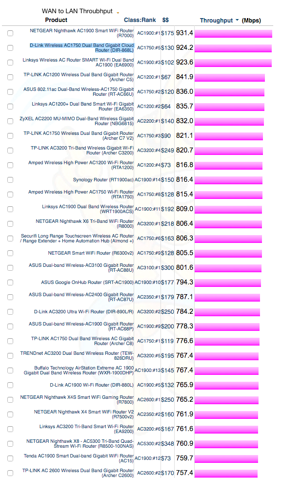 2016-17 reviews Best wireless routers of 2017 - CNET Model Price Performance Asus RT-AC88U $300 9 Editors Choice Linksys WRT1900ACS $220 9 1 USB 3.0 +1 USB 2.0 Netgear Nighthawk R7000 AC1900 $180 8 1 USB 3.0 +1 USB 2.0 The 10 Best Wireless Routers of 2017 | PCMag.com D-Link AC3200 4.5 Editors Choice Asus RT-AC68U -AC1900 4.5 Editors Choice Linksys EA7500 AC1900 4.0 Editors Choice Netgear Nighthawk X45 R7800 4.0 Netgear Nighthawk X6 AC3200 4.0 Dual Band Router - Ranking | SmallNetBuilder Listed by class (AC1900, AC3200) Score is based on performance only (low = better) AC1900 Downlink Throughput 2.4 GHz (Mbps) 5 GHz (Mbps) LAN Price Score Avg Max Range Avg Max Range* Throughput UDP NETGEAR R7000 Nighthawk AC1900 $175 24 69 351 40 165 896 118 931 1.8 Gbps ASUS RT-AC68U AC1900 $114 36 70 354 31 233 825 92 754 1.1 Gbps Linksys EA6900 AC1900 $123 43 86 129 27 245 512 83 923 Linksys EA7500 AC1900 $162 44 99 154 22 266 624 53 746 Linksys WRT1900AC AC1900 $140 D-Link DIR-880L AC1900 $140 ASUS RT-AC1900P AC1900 $200 65 299 234 849 857 D-Link DIR-879 AC1900 $125 46 321 184 790 1.9 Gbps AC3200 Tri-Band Downlink Throughput 2.4 GHz (Mbps) 5 GHz (Mbps) LAN Price Score Avg Max Range Avg Max Range* Throughput NETGEAR R8000 AC3200 $227 20 91 127 39 253 487 107 806 ASUS RT-AC3200 AC3200 $200 22 93 131 35 282 564 126 725 D-Link DIR-890L/R AC3200 $250 25 92 131 40 238 470 79 784 TP-LINK Archer C3200 AC3200 $200 32 TRENDnet TEW-828DRU AC3200 $188 38 Linksys EA9200 AC3200 $130 39 85 126 23 195 446 51 762 Linksys WRT3200ACM AC3200 $208 63 226 204 672 847 Mbps Note: Simultaneous throughput (multiple clients) is on the order of 850 Mbps - 1.6 Gbps for TCP and 850 Mbps - 1.8 Gbps for UDP * Range: Speed with a client 35 ft away from the router where there is one wood floor, one lower level sheetrock wall and a sheetrock ceiling between router and Client. See Does An AC Router Improve N Device Performance? - SmallNetBuilder AC5300 - Ranking | SmallNetBuilder Max Downlink Throughput Price 2.4 GHz 5 GHz Linksys EA9500 Max-Stream AC5400 $350 451 Mbps 587 Mbps ASUS RT-AC5300 Wireless AC5300 $340 429 Mbps 745 Mbps NETGEAR R8500 Nighthawk X8 AC5300 $350 450 Mbps 885 Mbps D-Link DIR-895L/R AC5300 Note: Simultaneous throughput (multiple clients) is on the order of 1.6 Gbps for TCP and 1.0 Gbps for UDP 10 Best Wireless Routers - RelevantRankings.com Asus RT-AC88U Tri-Band AC3200 $300 9.4 Asus RT-AC68U Dual-band - AC1900 $173 9.3 D-Link DIR-890L/R AC3200 $280 9.2 Linksys WRT1900ACS Dual-Band AC3200 $228 9.2 Netgear Nighthawk R7000 AC1900 $185 9.1 Tenda AC15 AC1900 $ 85 8.9 Linksys WRT 1200AC AC1200 $130 8.9 Linksys EA9200 AC3200 $215 8.8 TP-Link Archer C7 AC1750 $100 8.7 Wireless routers Ratings | Consumer Reports 2016 Price Score Linksys AC2600 (EA8500) $240 89 (very good far away) Asus AC1200 (RT-AC55U) $100 76 (fair far away) Best Buy Netgear AC1900 Nighthawk X4 (R7000) $170 73 (good far away) D-Link AC1200 (DIR-850L) $84 70 (poor far away) Linksys AC1900 (EA6900) $180 60 (poor far away) not rcommended The Best Wi-Fi Router (for Most People) | The Wirecutter TP-Link Archer C7 $100 TP-Link Archer C8 $125 (USB 3 ports) Netgear R6400 AC1750 $125 support for Time Machine backups 1 USB 3.0 + 1 USB 2.0 Best Router 2017 - Get a Better Wi-Fi Signal at Home | Tom's Guide Model Price Throughput at 140' Linksys WRT1900ACS $220 297 Editors Choice 2017 Asus RT68U 802.11n $195 Netgear R6220 AC1200 $60 283 USB 2 Netgear Nighthwak X8 AC5300 $370 289 Editors Choice 2016 More expensive routers have USB 3.0 (5 Gbps vs 450 Mbps for USB 2) for faster access to storage devices attached to the router. See Network Interfaces. | ||||||||||||||||||||