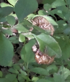 A month or two after the cicada adults have laid their eggs, many of the tree branches in which the eggs were inserted die. This is called "flagging" and it can look like considerable damage has been done. Fortunately, this damage is only dangerous to small trees and shrubs. Mature trees rarely suffer long term damage.   Holes where the nymphs emerge             Slits where eggs are deposited