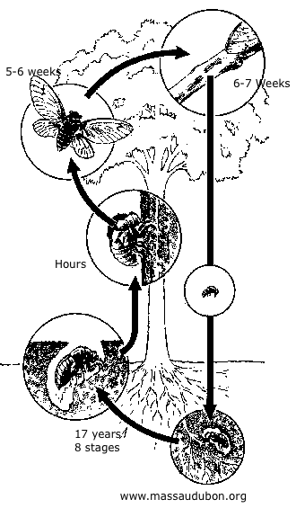 After mating, the female cuts V-shaped slits in the bark of young twigs and lays approximately 20 eggs in each, for a total of 600 or more eggs.fter about six to ten weeks, the eggs hatch and the newborn nymphs drop to the ground, where they burrow and begin another 13 or 17-year cycle.