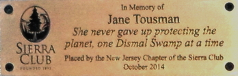Testimonials: Robert Spiegel, chairman of the Dismal Swamp Preservation Commission said. "Jane Tousman and those who worked with her set the groundwork for the work that the Edison Wetlands Association has been able to accomplish. Jane is my personal hero, and I have always looked to her as my moral compass for what was good and right in our community."