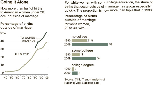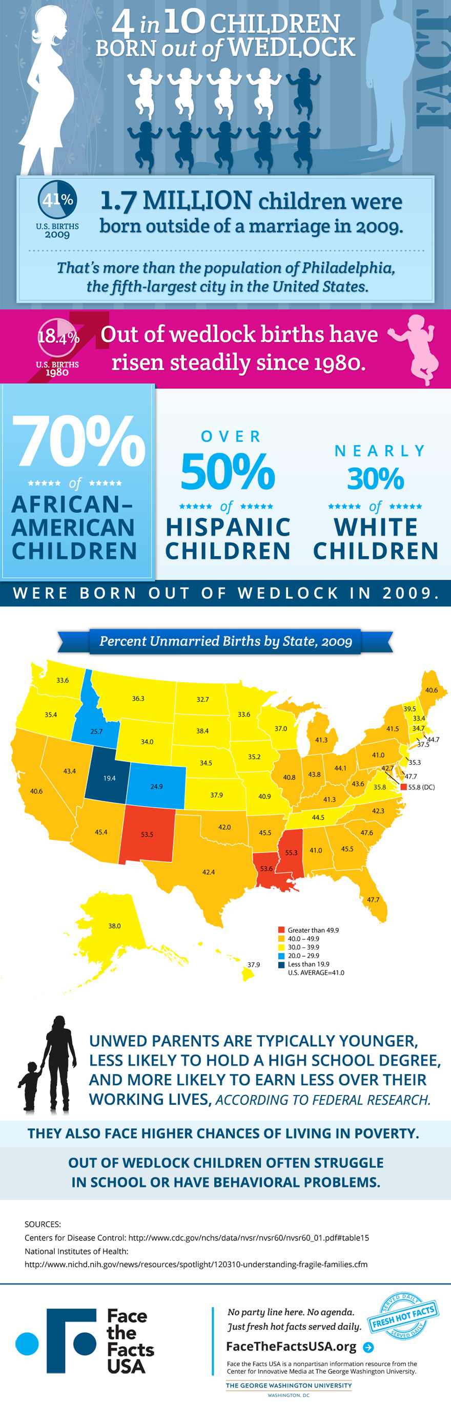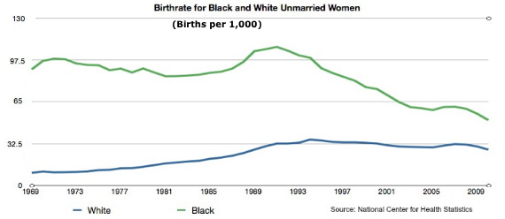 Change in single mother birth rate from 1970 - 2010 Whites +270% 10.4 - 28.4 Blacks -48% 97.5 - 52.5Source: The Atlantic, June 2013 Unwed mother rates: 72% Blacks 66% Native Americans 53% Hispanics 29% Whites 17% AsiansSource: Blacks struggle with 72 percent unwed mothers rate | NBC News