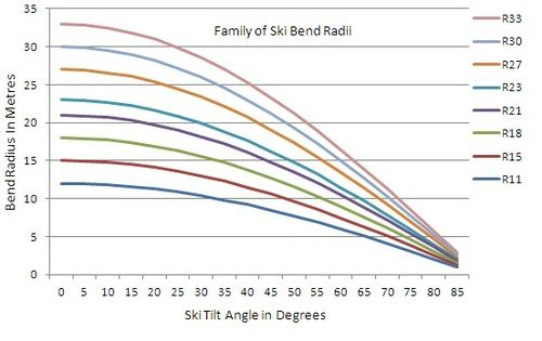 Graph of bend radius (Calculated by the Howe method) - for eight different skis. Each ski is made with a different fixed sidecut radius (R11, R15 ... R33).![]() Longer skis of GS cut are seen to be more responsive (That is change in bend radius resulting from a given change in inclination angle). This can be seen by the slope of the curve for each ski. An edge angle (on the snow) of 60 degrees (cosine = .5) creates a theoretical carving radius of one half the ski's sidecut radius. 75 degrees (cosine = .26) nearly cuts the theoretical carving radius in half again--about one quarter of the ski's sidecut radius When the ski bends into a tighter radius arc than the turn the skier is trying to make, it will not carve--or hold--nearly as well as when tipped to the optimal angle.