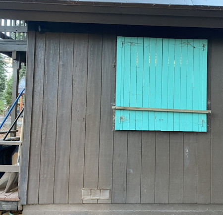 So I covered the front windows with plywood. I also replaced the storm window over the broken window with plywood, producing a bear-proof and weather-proof seal for the LR.