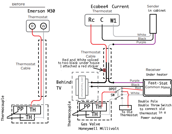 See also 2 wire install for using with the FAST-STAT HVAC Wiring extender under the heater, which we have.