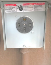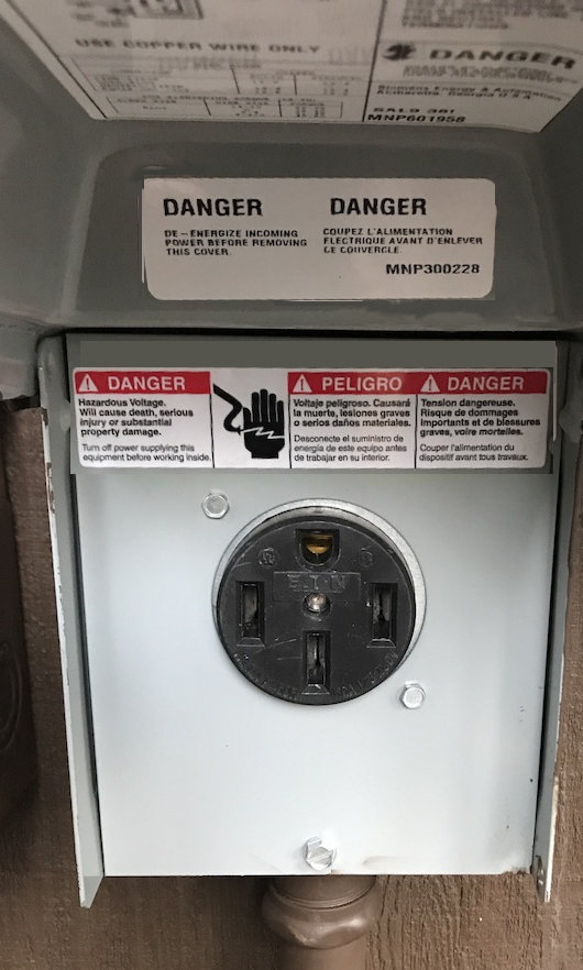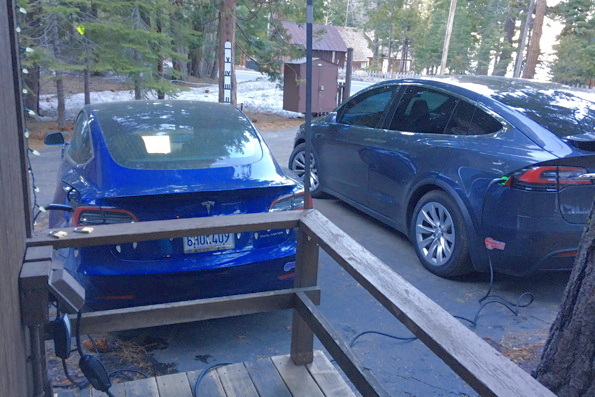 The cabin has 2 50 Amp 240 Volt Electric Vehicle (EV) charging receptacles on the front porch with NEMA 14-50 sockets. The NEMA 14-50 is standard for most recreational vehicle (RV) parks. You will need your own adapter to plug your car's charging cable into the NEMA 14-50.