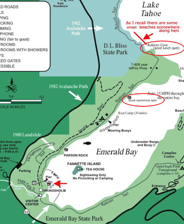 |  Sugar Pine Point Calawee Cove, Rubicon Cove, Vikingsholm at D. L. Bliss State & Emerald Bay State Parks: Not a whole lot of parking there down past the DL Bliss campground, we usually try to get there before 10am to make sure they'll sell us a parking pass before it fills up. Go all the way to end of the road past Lester Beach to a trail down to Calawee Cove Beach. From the trailhead at the first parking lot near the campground the Rubicon Trail takes you 1.5 miles to Rubicon Cove Beach (a hidden non-maintained beach along the trail).