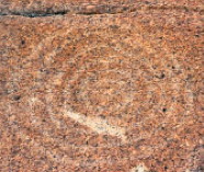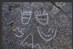 | - Just past the arched Rainbow (Pioneer) Bridge on old hwy 40 (Donner Pass Rd.) heading toward Donner Lake. Believed to be created by  the Martis Indians (some say ancestors of Washoe, Maidu  and Paiute Indian Tribes) during the Middle Archaic Period, 4,000 years ago. Park at the China Wall parking area around the bend 1/4 mi. from the bridge. In 1966, Louis A Payen completed a comprehensive inventory and analysis of prehistoric rock art in California's northern Sierra Nevada. This outstanding study identified 133 rock art sites, classified into two major groupings or traditions, Pit-Groove and Abstract-Representational. The two groups were further subdivided into seven separate categories or styles - each defined by a group of attributes and associations. Style 7 (High Sierra Abstract-Representational) (Donner Pass - Site CA-NEV-5) These are distinctive petroglyph panels on bedrock surfaces in the higher elevations of the northern Sierra Nevada. Style 7 rock art panels are more complex and contain a greater variety of design elements than any other prehistoric rock art style in the northern Sierra Nevada region, and although considerable variation exists in design elements, there is also an underlying rigidity. Common designs include concentric circles, simple circles elaborated by line elements, wavy lines of varying complexity, tracks, and anthropomorphic-zoomorphic representations. Payen defined Style 7 rock art using a sample of 13 sites, and described it as the most distinctive style of the seven. He suggested that the track element may be diagnostic for Style 7, occurring at 11 of his 15 sites. The majority of Style 7 petroglyph elements are abstract, consisting of circles, wavy lines, zigzags, and arrangements of these elements into complex designs. We analyzed two of the more naturalistic and readily recognizable petroglyph elements, the bear track, and the anthropomorph (human stick figures). Evidence (location and chipped-stone lithics [tools] found nearby) supports the hypothesis of an association between these sites and the Martis Archaeological Complex. This evidence is fairly pervasive and argues for the placement of this style of rock art firmly within the Middle Archaic time period, from 4,000 to 1,500 B.P. which has been equated with the Martis Complex.