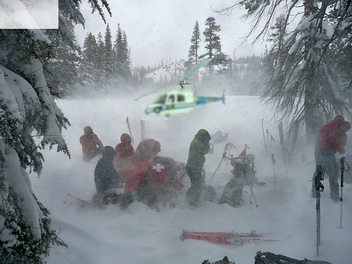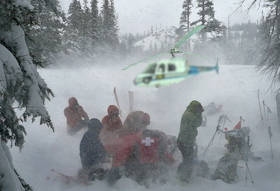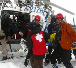 Our team's objective for the day was to pass through our recently searched areas and then follow a drainage out to nearby Paradise Valley. Overhead, we could hear the thump of the helicopter rotors as the two aircraft assigned to air support searched the area. Less than an hour into our resumed search we noticed the smaller helicopter, a California Highway Patrol A-Star B3, hovering close by. The CHP helicopter had received the coordinates of a potential sighting from the Chinook, and the pilots went in for a closer look. Kevin had signaled the aircraft by tying a corner of his space blanket to a ski pole, and waving it while sitting on the edge of a small clearing. The highway patrol aircraft confirmed the sighting of the subject, but could not land due to low fuel and lack of a suitable landing zone. We were the closest rescue team and they relayed his coordinates to us as they headed out to a nearby airport to refuel and return for the rescue. Not bothering with the GPS, we moved quickly to follow the bearing towards the coordinates and soon could hear Kevin yelling and whistling. Tom was the first ground rescuer to make contact with him; it was now 12:30 on Thursday, about 44 hours since he'd been reported missing. When we arrived, Kevin was huddled in the snow. Tom and I, as ski patrollers, assumed responsibility for Kevin's medical care. Derek from Contra Costa assumed field command and orchestrated the communications relay and evacuation logistics. While privacy constraints prohibit a detailed description of Kevin's condition or our assessment, we had time to wrap Kevin in blankets and sleeping bags, complete a full assessment and begin care by the time the helicopter refueled and returned about 45 minutes later. We provided insulation including gloves, ensolite pads and sleeping bags, assisted by a nurse practitioner from El Dorado's Search and Rescue who arrived 15 minutes later. As the rescue helicopter returned, the weather was starting to close in again and the pilot was anxious to get the patient evacuated and the aircraft back to safety. With hypothermia a real possibility, the decision was made not to hoist Kevin via "screamer suit", but to try to land the helicopter and backboard him for a gentler helicopter extrication.