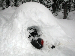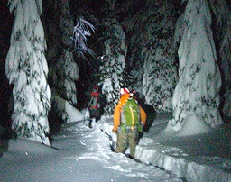 Search and rescue is often a mechanical operation. Teams are sent out to "clear" individual grids created on a map; each subsequent day's searches are based on the ability of the previous teams to clear those grids. The speed at which the search is initiated matters: the search area expands with each day the missing person can travel away from the point they were last seen. For each grid it was important to check for the possibility that the lost person was either responsive or unresponsive, and searchers are asked to assign two distinct probabilities of discovery for each grid. With two feet of new snow having fallen since Kevin was reported missing, our chances of finding a unresponsive subject were very small. Our personal GPS units were configured to track our search progress and to display the coordinates of each grid area. At the end of the search, the GPS log of our paths would be downloaded and used to plan the next day's search operations. Having been briefed and given radios and dispatch sheets, we emerged from the incident command center and headed out to the snow cats. Several of these tracked vehicles, smaller version of the vehicles used to groom ski resorts, were parked around the incident command center. Like the previous night's NSP search team, Tom and I were traveling fast and light with a minimum of gear and planning to depend on Tahoe Backcountry Ski Patrol's backcountry caches for our overnight supplies. Our team crammed into the back of two snow cats and soon we were cruising through an area normally closed to motorized travel; exceptions are made when life is in jeopardy. Twenty bumpy minutes later we arrived at the base of Castle Pass, a short 200 foot climb up to the ridge overlooking the Peter Grubb hut. This was as far as the snow cats could go: the incline was too steep to proceed beyond this point. At 2 a.m. Thursday morning, our ten searchers from Contra Costa and TBSP-SAR began the climb up Castle Pass and along the ridge toward the Sierra Club's Peter Grubb Hut. One Contra Costa SAR team member, Derek, was also on backcountry ski gear and he joined us climbing up and over the main ridge overlooking Round Valley. The seven other searchers traversed around on snowshoes. We skiers descended quickly towards the hut, spreading out and attempting to give extra coverage to additional grids as we headed towards our main search region. The Peter Grubb Hut lies near the center of Round Valley, flanked from north to east by the imposing sights of Castle Ridge and Basin Peak, and to the south and west by a gentle downward sloping forest filled with complex terrain including ravines. It was the ravines to the west that we would search that night. The key to a grid search is keeping your partners close enough that you can see and communicate with one another, but far enough away that you are able to reliably cover a large amount of ground. Already we had noticed that the two feet of fresh snow was impeding our travels. We decided to have the skiers cover the perimeter of the search areas, while the snowshoers fanned out and attempted to cover the interior sections. With the three-quarter moon overhead, the other searchers and their tracks were clearly visible without headlamps. The search area was a mostly flat region with a gentle downslope away from the hut, abutting a large meadow and an imposing buttress of cliffs. The deep snow was impeding travel, and the snowshoe teams switched to moving single file to cover ground more quickly. By 6 a.m., our team of skiers had barely managed to cover the perimeter of the first of three search areas and we decided to pause our search activities and return to the hut for some rest. We were asleep as our heads hit the mattresses. Search and rescue personnel should be equipped to spend the night out if necessary, and to self-rescue or self-evacuate. While Tom and I had backcountry caches of equipment to rely upon, Tom decided to forgo the trip to the cache and napped under a pile of down jackets. Despite our exhaustion, we were all awake again after just three hours, readying our gear by 9:30 a.m. The sun was shining and the untouched, snow-filled valley was radiant -- this was the break in the storm everyone had been waiting for. If our missing person was going to be found, we told ourselves, today was the day. Another team of TBSP-SAR rescuers, patrollers Eric Chesmar and Ted Hullar, inserted that morning on the other side of Castle Pass looking for evidence that the missing hiker might have made it over the pass and then succumbed to fatigue or injury. Their morning progress was significantly impeded by the considerable avalanche danger and they spent much of the morning navigating around unstable, overhanging cornices before returning to base.