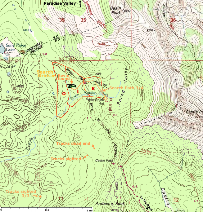 Kevin had wandered around for about two miles during his ordeal, eventually trying to backtrack to the Peter Grubb Hut and ending up less than a half-mile away. Disoriented by the sloping descent along his path, he missed his target and settled in the ravined area downhill from the hut where he built a tiny shelter in a snow drift. The shelter was barely large enough for his head and shoulders and left the rest of his sleeping bag exposed to the clear night sky. At the closest point during our previous night's search, our team of skiers passed within 200 meters of his shelter. What kept him alive was his sleeping bag and his resourcefulness, staving off dehydration by tying his water bottle to a string and lowering it through a hole in a snow bridge to a creek to get water. During the cold, clear night he even lit a propane lantern inside his sleeping bag to keep warm, but quickly realized the fumes would not be healthy. Though he credited survival television shows for his resourcefulness, and they did keep him alive, his crude attempts at shelter construction on level ground highlight the benefits of competent instruction in backcountry safety practices. Not long after Kevin lifted off we were again socked in by snow and low clouds. With no hope of an air evacuation for our rescuers, Tom and I led a complement of thirty search and rescue volunteers on the trek back up to the Peter Grubb Hut, then up and over Castle Pass to the phalanx of waiting snow cats. More than eighty searchers participated in this incident, with search and rescue resources from Nevada, Contra Costa, Placer, El Dorado, Washoe, and Marin counties, the California Air National Guard, and our Tahoe Backcountry Ski Patrol Search and Rescue Team. Tahoe Backcountry Ski Patrol Search and Rescue is looking for qualified ski patrollers in Northern California to join our search team. Find out more by visiting tbsp.org/sar or emailing sar@tbsp.org. Timeline: Tue. 3/2 - Kevin leaves Peter Grubb Hut ahead of his friends who plan to catch up with him on the hike back to the trailhead. He misses the trail to Castle Pass and veers off to the west. After arriving at their cars, his friends waited for several hours before calling the local Nevada County Sheriff. 7:40 PM TBSP SAR called 10 PM Search starts Some tracks are found along a snowmobile trail going the wrong direction. Tracks are soon covered by heavy snow. A search of the area found more tracks which were again lost. At some point Kevin turns around to head back to Peter Grubb hut. Wed. 3/3 - Searchers return in early morning More ground teams searched the area throughout the daylight hours but, steady snowfall and low visibility hampered the search. Snow stops by nightfall having dropped 2 feet of new snow. Forecast calls for a low of 4° wed night. 12 AM More searchers head out to search grid areas K, L & O NW of Peter Grubb hut. Thu 3/4 6 AM Searchers head back to Peter Grubb hut for some rest Later that morning searchers head out again to search an area north of the hut A helicopter spots Kevin and radios his coordinates to the search team as the helicopter headed back for gas. Tom reaches Kevin at 12:30 PM Rescuers are warming Kevin up as the helicopter returns to take him to the hospital  zoom out | Google map of search area | Map page w/ satellite map Acknowledgment: Some photos courtesy Contra Costa County Search and Rescue