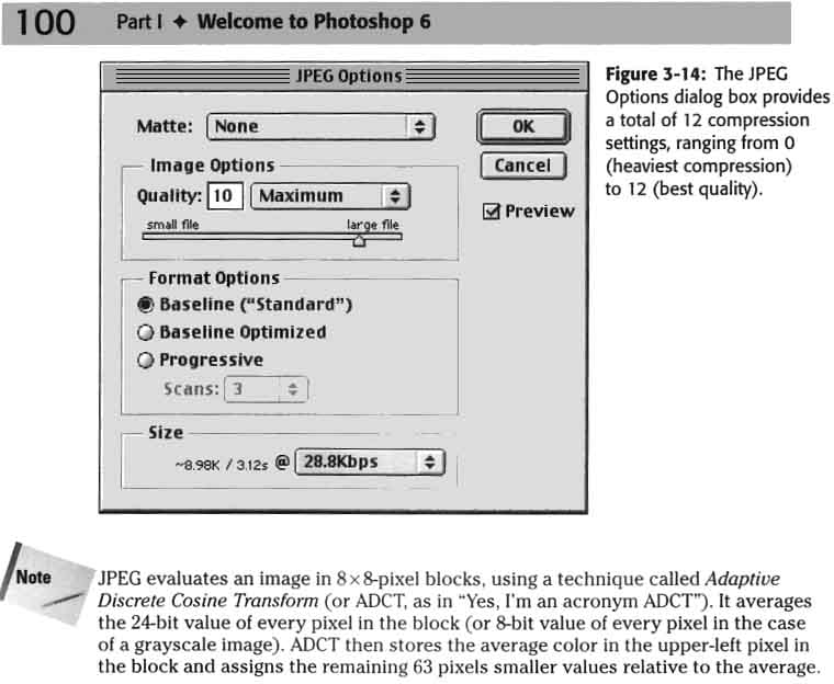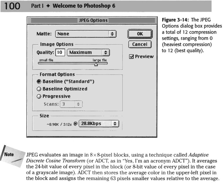 2. Sometimes a lossless compression algorithm called LZW is used with tiff images, but it is not universally supported. 3. Most graphic programs allow you to save jpeg images with different quality levels. Higher quality results in larger file sizes. Photoshop has levels 1-12, others use 1-100. | |||||||||||||||||||||||||||||||||||||