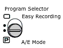 Easy Recording automatically sets shutter speed, focus, ... To select presets for focus, exposure, ... p. 46 Set Program selector to P In camera mode Push set dial in to actaivate Rotate to select AE (Auto Exposure) mode: p 46 - |
